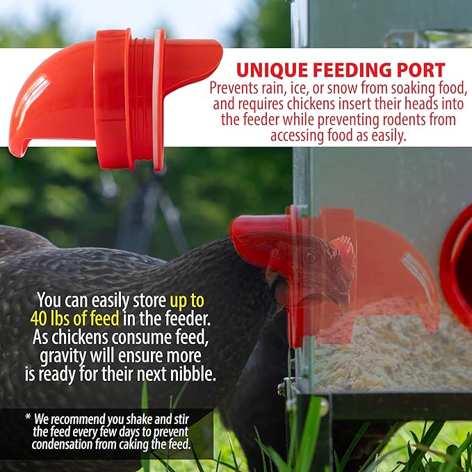 • [HIGH QUALITY MATERIAL]: The feeder body is made of thickened galvanized metal, which is durable and can withstand harsh weather and the test of time better than most plastic chicken feeders. The feed ports are made of high-quality plastic and each comes with a cover that you can open and close at any time.