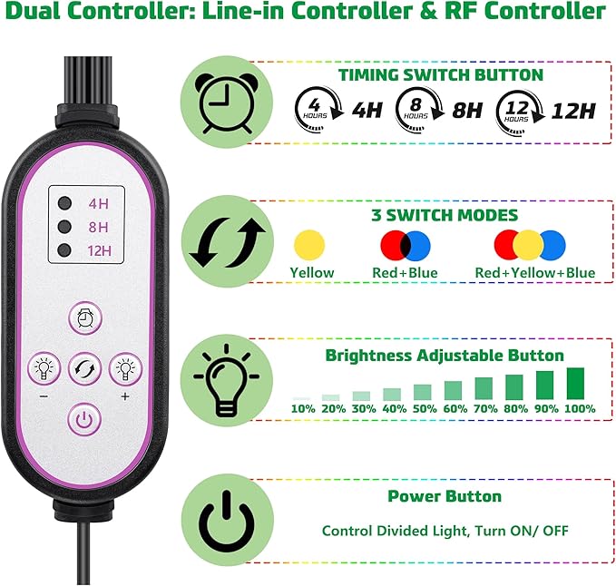 • Timing function and dual controller: This plant light comes with both an inline controller and an RF controller (effective up to 30 meters away). You can set them up for automatic lighting intervals of 4H / 8H / 12H, with auto on/off, eliminating the need for daily manual operation. Each LED head can be controlled independently