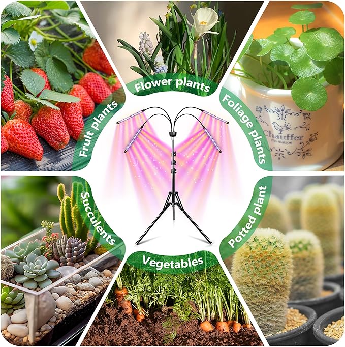 • Adjustable height and angle: This grow light lamp with a tripod stand can be extended from 15” to 63”. The flexible goosenecks can be rotated 360 degrees, allowing you to easily adjust the desired height and angle to suit your plants' needs