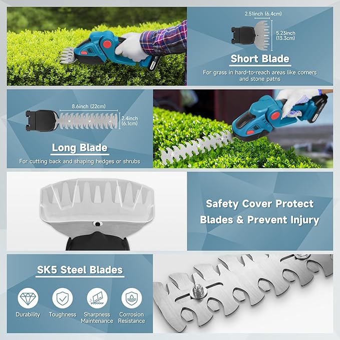 • 【Professional 2-in-1 tool】Designed as a special 2-in-1 tool, DODOWIN cordless lawn trimmer is easy to switch from grass shear to hedge trimmer quickly and easily without any tools by using the blade release button.The short blade (5.23 inches length) is designed for cutting grass, weeds, and similar tasks, while the long blade (8.66 inches length) is ideal for trimming hedges, shrubs, and thin branches on trees.