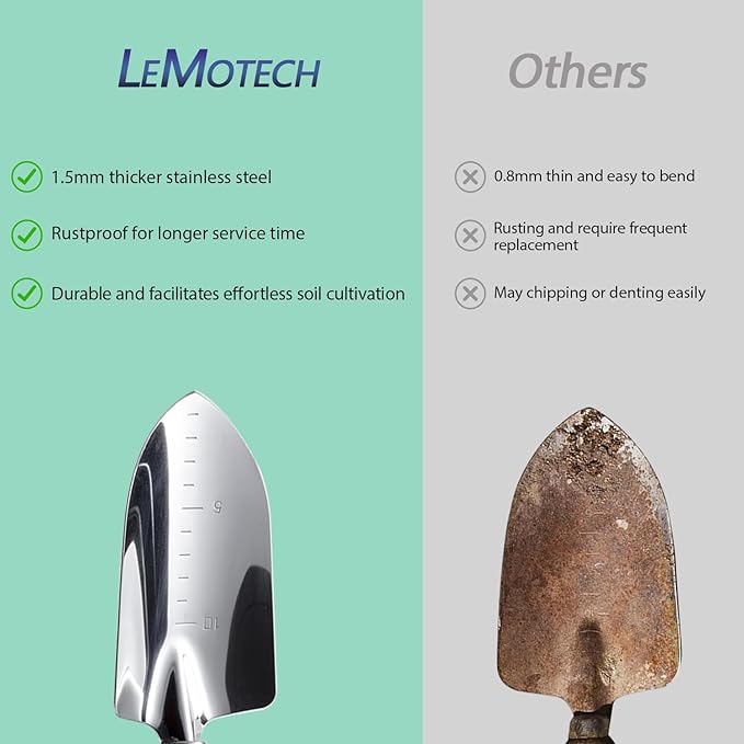 • [ Upgrade Garden Tool Set ] Stainless steel garden tools with thickness of 1.5mm provide added strength and durability. Wooden handle smoothly polished and gives a comfortable grip and also protect your hands.