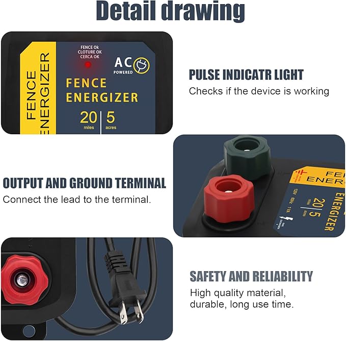 • ๐ƒ๐ฎ๐ซ๐š๐›๐ฅ๐ž ๐š๐ง๐ ๐–๐ž๐š๐ญ๐ก๐ž๐ซ-๐‘๐ž๐ฌ๐ข๐ฌ๐ญ๐š๐ง๐ญ - Built to withstand outdoor conditions, the Electric Fence Energizer features a robust construction designed for long-lasting performance. It and the included aluminum wire are weather-resistant, ensuring that your electric fencing system remains operational regardless of the elements, thus providing continuous protection.