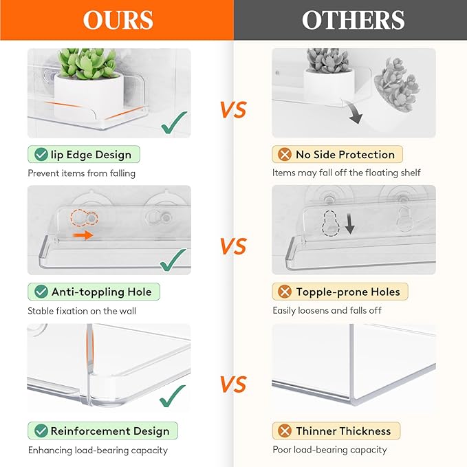 • Easy Installation: Installation is hassle-free with no drilling required. Simply clean the surface with a wet wipe or alcohol pad, then firmly press the suction cups onto the window. This quick and easy setup allows you to enjoy your new shelf in no time
