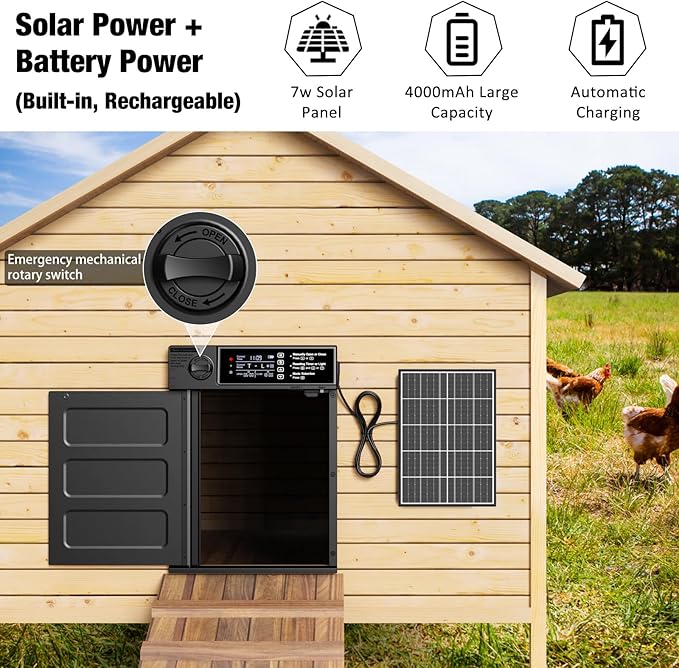 • 【Fail-Safe Security】Unlike basic doors, our chicken coop door features an exclusive emergency button that instantly overrides the system during power outages or malfunctions, ensuring your flock's safety even during solar power failures.