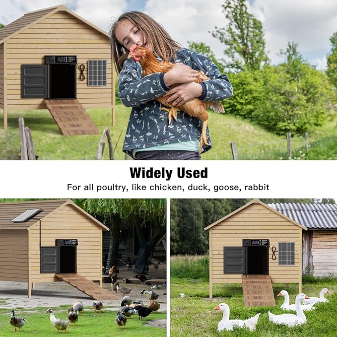 • 【 Fits for Various Poultry】Automatic Chicken Door Solar is versatile to work well for most chicken coops, chicken house, nesting box and small poultry, such as ducks, geese, rabbits and turkeys. Especially beneficial for coops situated in remote areas. Protect your poultry from predators with reliable security.