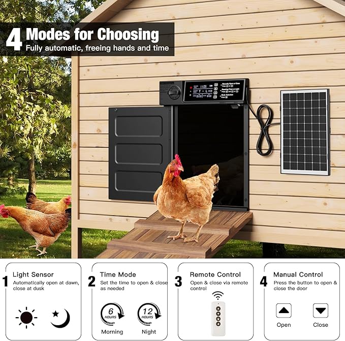 • 【Automate & Customize】Auto Chicken Door with 4 innovative way to open the door. Operate your chicken door effortlessly using timer mode (set schedules), light sensor mode (adjusts to daylight), manual panel buttons, or the included remote—4 flexible options for total coop control—no daily hassle required.