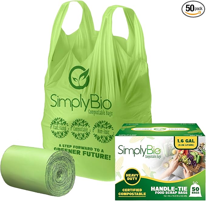 1.6 Gallon Compostable Trash Bags Liners Handle, Heavy Duty Extra Thick 0.6 Mil, 6.06 Liter, 50 Bags, Small Kitchen Food Scrap Waste Bag, ASTM D6400, US BPI and OK Compost Home Certified