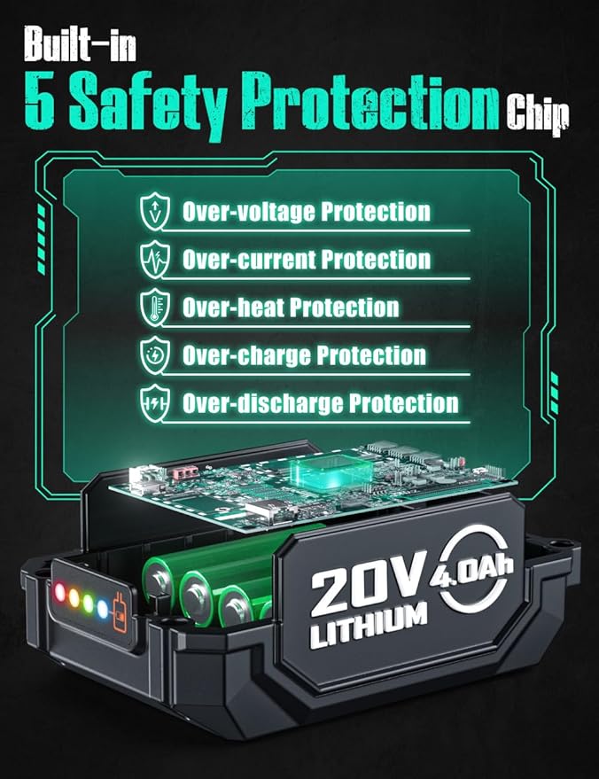 - šćEfficient 4000mAh Batteries with Smart Power IndicatorćRechargeable leaf blower cordless with 4.0Ah battery for uninterrupted use. KIMO leaf blower cordless battery 5 protection chipāovervoltage/current/heat/charge/discharge protection ā ensuring reliable performance, extending lifespan by 150%. A built-in 4 level power indicator light lets you monitor battery level in real time. Moreover, the charger will display a green light when fully charged, and a red light means it is still charging.