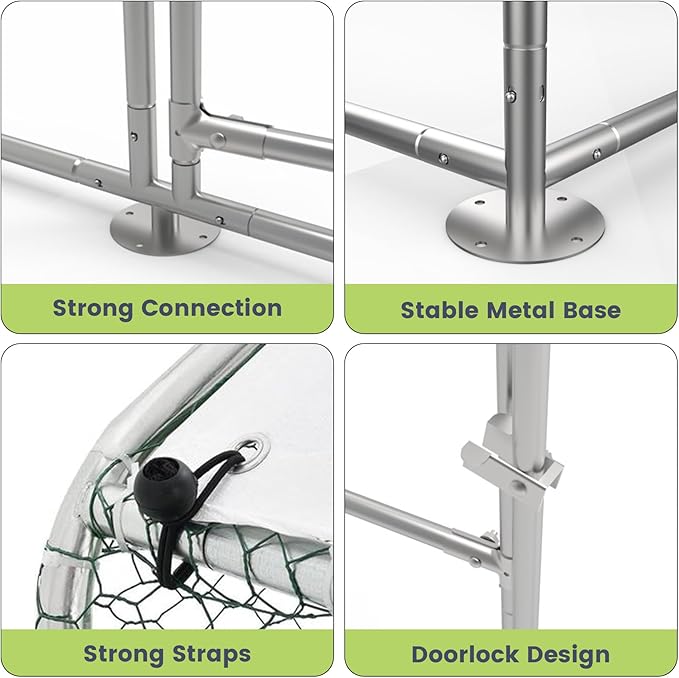 • [SAFE AND VENTILATED COATED HEXAGONAL WIRE MESH] The large chicken run is expertly crafted from high-quality coated steel wire mesh, which not only prevents your animals from escaping but also promotes optimal airflow. The small gaps between the mesh panels enhance safety by safeguarding your pets from potential predators, while allowing for maximum ventilation. Your animals can enjoy their space while you can rest easy, they are secure.