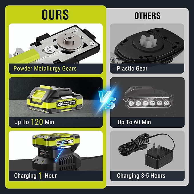 • ✅ UL-Listed fast charger & high-performance lithium battery, 60-minute fast charger – enjoy 120+ mins (2 x 2000mAh) continuous runtime. Battery has a built-in intelligent protection system. Compatible with EWORK 21V series (Leaf Blower/String Trimmers). 500+ cycle battery lifespan tested, Battery Management System (BMS) actively guards against overcharging/overheating/short circuits while maintaining 80% capacity after 800 cycles