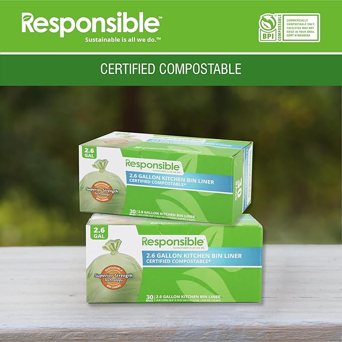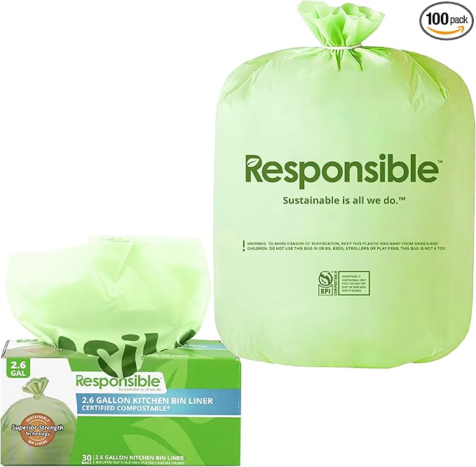 Kitchen Bin Liners, Certified Compostable, Heavy Duty Multipurpose Food Scrap Bags, Made from Compostable Materials (2.6 Gallon Flat Top, 2.6 Gallon (30 Count))