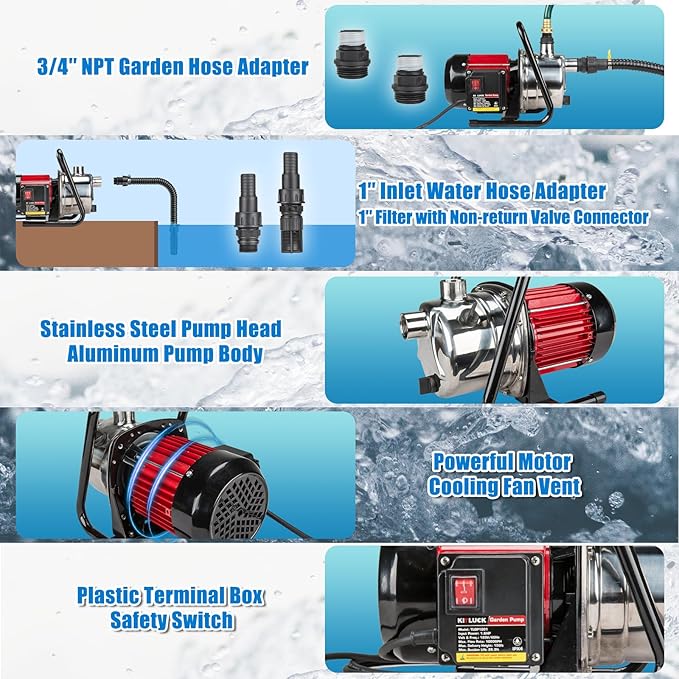 • 【More thoughtful design】 More than other pumps, our shallow well water pump comes with a unique set of fittings for your water inlet hose, which includes a 1″ Inlet Water Hose Adapter and a 1″ Filter with Non-return Valve Connector. This set has a filtering function that prevents contaminants from entering the pump and reduces the risk of clogging the motor. In addition, the 3/4″ NPT Garden Hose Adapter allows you to switch between the 1″ outlet and inlet for multiple connections.