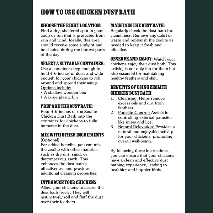 • All-Natural Zeolite Dust Bath: Treat your chickens to a premium grooming experience with our 100% natural Zeolite dust. This dust bath is designed to help maintain healthy feathers and promote natural dust bathing behavior.