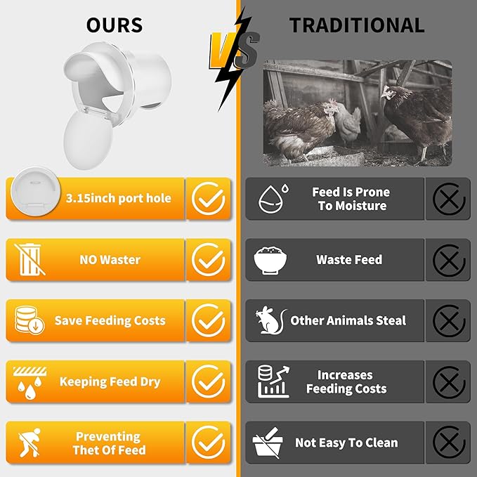 • 🐤RAIN & THEFT PROTECTION: The feeder's curved back design ensures smooth feed flow and prevents feed buildup. The extended hood and removable stopper effectively shields against rainwater and deters birds and other small animals from accessing the feed.
