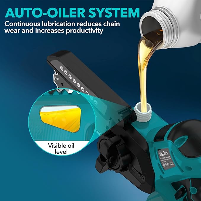 • CONVENIENT AUTO-OILER SYSTEM: This Portable Chain Saw Cordless is equipped with auto chain lubrication system, so you don't need to drip oil on the chain every once. Just pour the oil into the oil tank, and the saw chain will be automatically lubricated while the pruning chainsaw is running, minimizing friction and wear, and optimizing bearing and mechanical life