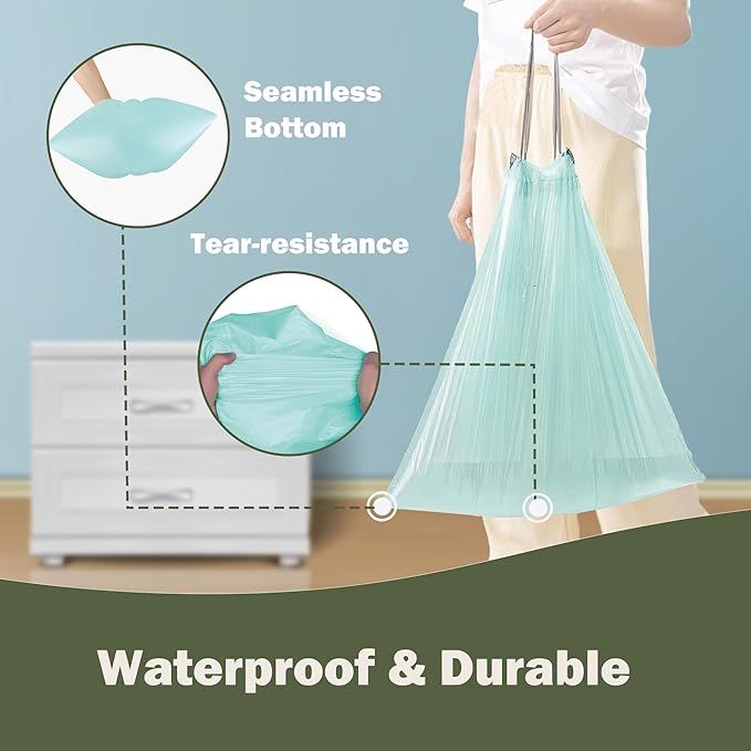 • Multipurpose: Our compostable waste bags unscented leak-proof, drawstring, strong.They provide the perfect fit for kitchen food waste, office trash, bathroom, bedroom, use for cat litter bags, baby poop bags