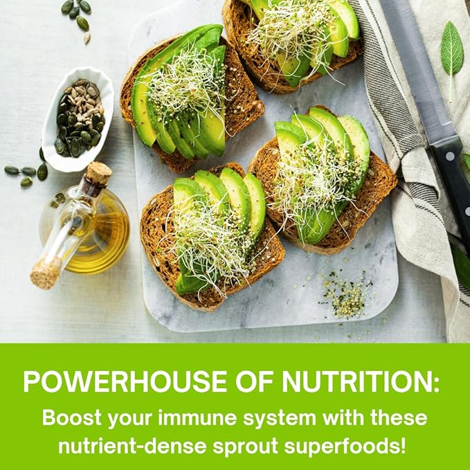 • POWERHOUSE OF NUTRITION: Boost your immune system with this nutrient-dense superfood! Rich in antioxidants, vitamins, minerals, essential amino acids, chlorophyll, and enzymes, these sprouts offer a wealth of health benefits to elevate your diet.