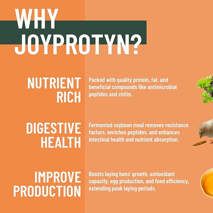 • Premium Protein Source for Healthy Growth: Joyprotyn’s BSFL feed packs 43% protein—2x the protein of typical chicken feed—to promote muscle and feather development. This nutrient boost supports vibrant plumage during molting and helps your hens produce more high-quality eggs throughout their laying cycle.