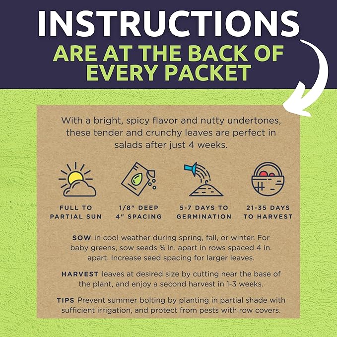 • 60 INDIVIDUAL SEED PACKETS: Roquette Arugula, Genovese Basil, Detroit Dark Red Beet, Cal Wonder Bell Pepper, De Ciccio Broccoli, Provider Bush Bean, Waltham Butternut Winter Squash, Nantes Carrot, Catnip, Tall Utah Celery, Santo Cilantro, Champion Collard Greens, Homemade Pickles Cucumber, Marketmore 76 Cucumber, Bouquet Dill, Rosa Bianca Eggplant, Florence Fennel, Parade Green Onion, Lacinato Kale, Buttercrunch Lettuce, Parris Island Romaine Lettuce.