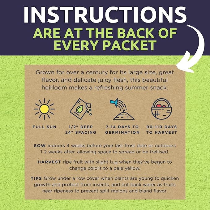 • 10 INDIVIDUAL SEED PACKETS: Hale's Best Jumbo Cantaloupe, Sweet Crimson Watermelon, Moon and Stars Watermelon, Sugar Baby Watermelon, Hearts of Gold Cantaloupe, Rocky Ford Green Melon, Baby Doll Watermelon, Ha'Ogen Melon, Iroquois Melon, Charentais Melon.