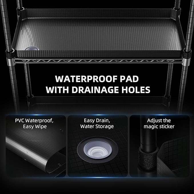 • ๐–๐š๐ญ๐ž๐ซ๐ฉ๐ซ๐จ๐จ๐Ÿ ๐ƒ๐ž๐ฌ๐ข๐ ๐ง ๐ฐ๐ข๐ญ๐ก ๐‚๐จ๐ง๐ฏ๐ž๐ง๐ข๐ž๐ง๐ญ ๐ƒ๐ซ๐š๐ข๐ง๐š๐ ๐ž: Each tier of the grow rack comes with a tray-style drainage mat featuring openable drainage holes. Made of waterproof PVC material thatโ€™s easily clean and reusable. Effectively helps keep your grow area neat.