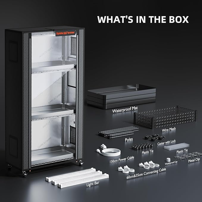 • What You Get: 6 X 24" Grow Lights, 3 X 13.8" Connecting Cords, 2 X 23.6" Connecting Cords, 1 X 59" Power Cable, 4 X Wire Mesh, 8 X 23.6" Support Pole, 4 X 11.8" Support Pole, X 4 X Caster with Lock, 1X Semi-Transparent Tent, 3 X Waterproof Mat, 36X Plastic Clip, 12 X Metal Clip, 16 X Plastic Tie, 1X Waterproof Cap, 1X User Manual, 2 Years Support Services
