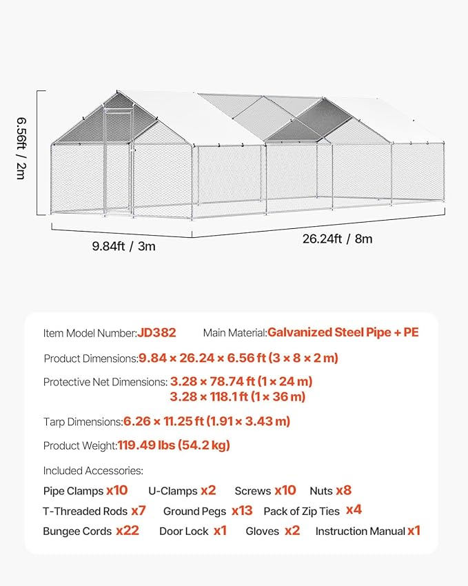 • Spacious Living Area: Offering a generous 9.8x26.2x6.5 ft of space, this large metal chicken coop features four-sided ventilation, creating a comfortable shelter for poultry. The PE-coated tarp provides sun protection, waterproofing, and tear resistance, shielding your poultry from weather.