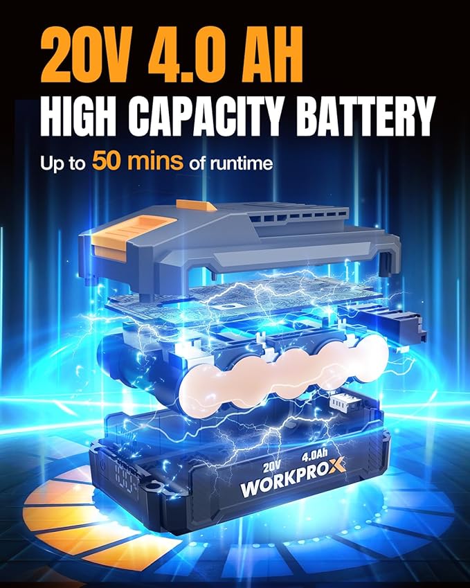 • 20V 4.0Ah Battery & Fast Charging: Powered by a 4000mAh battery, this electric chainsaw provides up to 50 minutes of operation and charges in just 1 hour. An LED power display helps track battery status, and it doubles as a portable power bank for emergencies