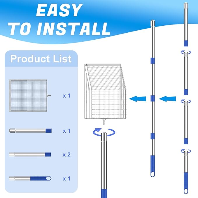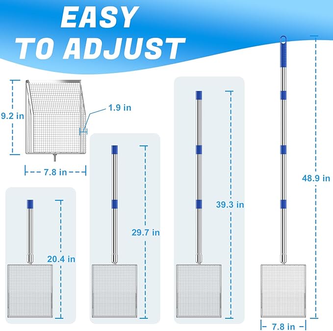 • 4-in-1 Adjustable Handle for Flexible Cleaning: The stainless steel handle features four adjustable lengths: 20.4", 29.7", 39.3", and 48.9", catering to different cleaning tasks and user heights. Ideal for cleaning chicken litter, rabbit droppings, and cat boxes, as well as collecting beach shells.