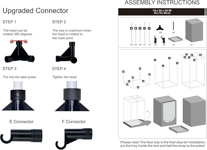 • Upgrade Design --- UPGRADED CONNECTOR--Durable PA Material Adopted, Anti-rust Reinforced Design, Adjustable Tightness According to The Pole, Hold Poles Tightly for Firmed Support. Multiple vents to accommodate fans and filter; ducting rectangle window with mesh to keep dust and insects out; Removable mylar floor tray easy to clean.