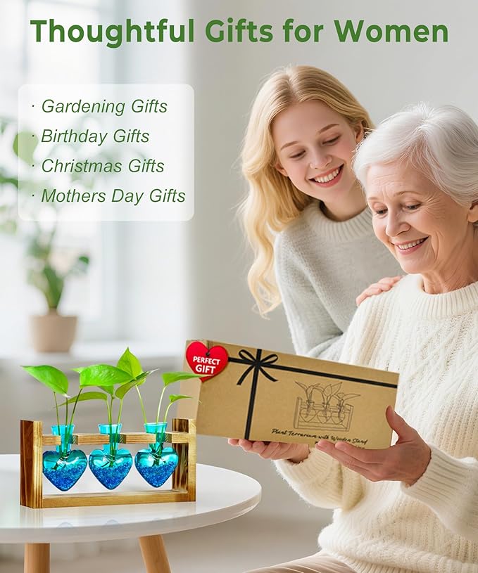 Nacome Plant Terrarium for Office Decor: Birthday Gifts for Plant Lovers Women Mom Wife - Wooden Stand Tabletop Planter 3 Bulb Glass Vase Heart Shaped for Hydroponics Indoor Home