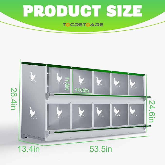 • Great Size for Family with long-lasting metal nest box: The complete set measures 53.5in. long x 13.2 in. wide x 26.4 in. high.Tocretoare nesting boxes for chickens are a must-have for all poultry hobby farmers looking to start or maintain their sustainable, ecological and homegrown farm. It is also suitable for other poultry such as ducks, geese and rabbits.Any using problem please let us know, we will responsible to solve it.