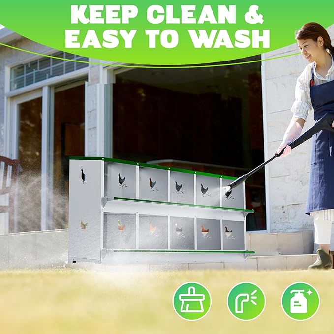 • Long-Life for Use: We made of galvanized steel for a strong and sturdy construction.Our heavy duty galvanized steel will last longer than ABS plastic.The nesting boxes are lightweight and will not rust or wear out over time.You can use the high-pressure water gun to wash at will to provide a clean laying space for the hens.