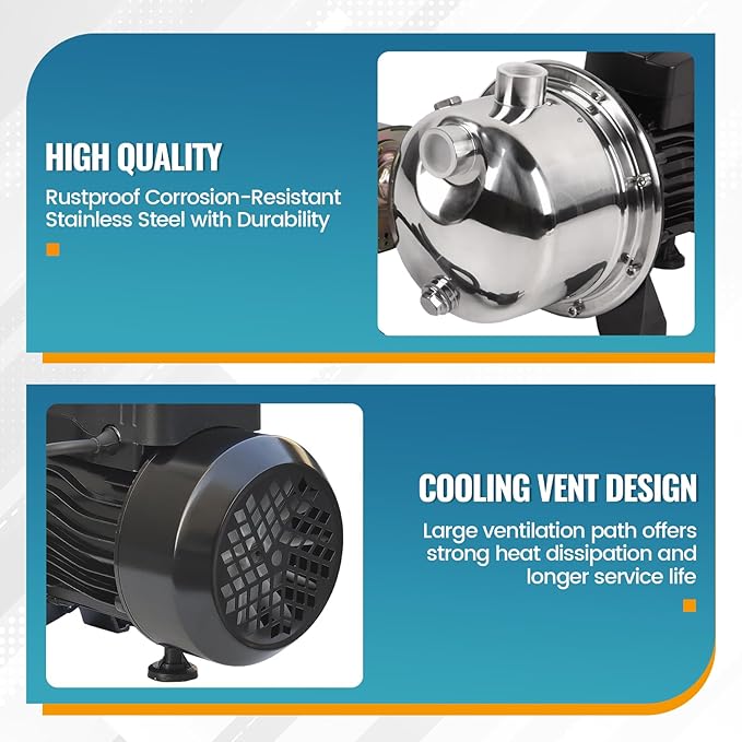 • 【Built to Last】Crafted from stainless steel, aluminum alloy, and ABS, our shallow well pump is wear-resistant and corrosion-resistant, making it ideal for outdoor use in courtyards and farms. Its durable design ensures longevity, allowing you to rely on its performance year after year.