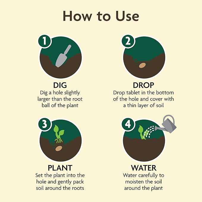 • To apply, drop a planting tablet at the bottom of a newly dug hole and cover with a thin layer of soil before placing your plant