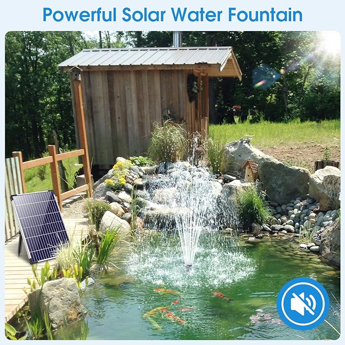 • ✔【Warm Tips】1.The solar pond fountain not include battery and does not work at night and completely cloudy. 2. Clean the pump regularly to prevent the pump from being clogged with dirt; 3.The pump needs to be submersed into water and ensure the solar panel has not been shaded.