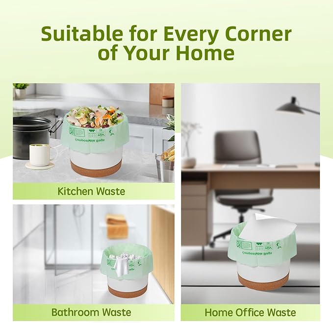 • [CERTIFIED COMPOSTABLE] : Made from certified compostable materials (ASTM D6400), these bags are an eco-friendly choice for composting food scraps and managing organic waste. You may notice a subtle, pleasant scent when opening the package—this is the natural aroma of cornstarch, a key ingredient in these bags.