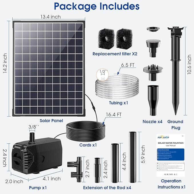 • ⛲【High Efficiency and Quality】POPOSOAP 25W solar water pump is made of 100% glass panels and Grade A+ solar cells, which is more durable and better solar energy conversion efficiency, making the water spray more stable and long-lasting. The sunlight stronger, the higher the height of the water spray.