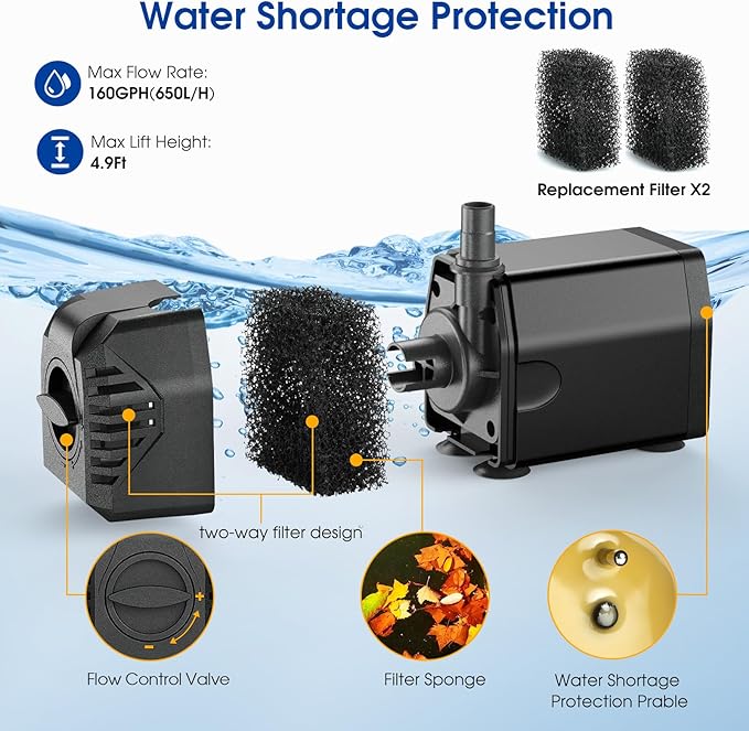 • ⛲【Water Shortage Protection】The solar pond pump comes with water shortage protection that will shut off when the water level is below the dry-run prable to protects the motor. Two-way pre-filter design to preventing leaves or dust from clogging the pump. The water pump is easy to detachable and we also give extra 2 filter sponges to replace when cleaning the pump.
