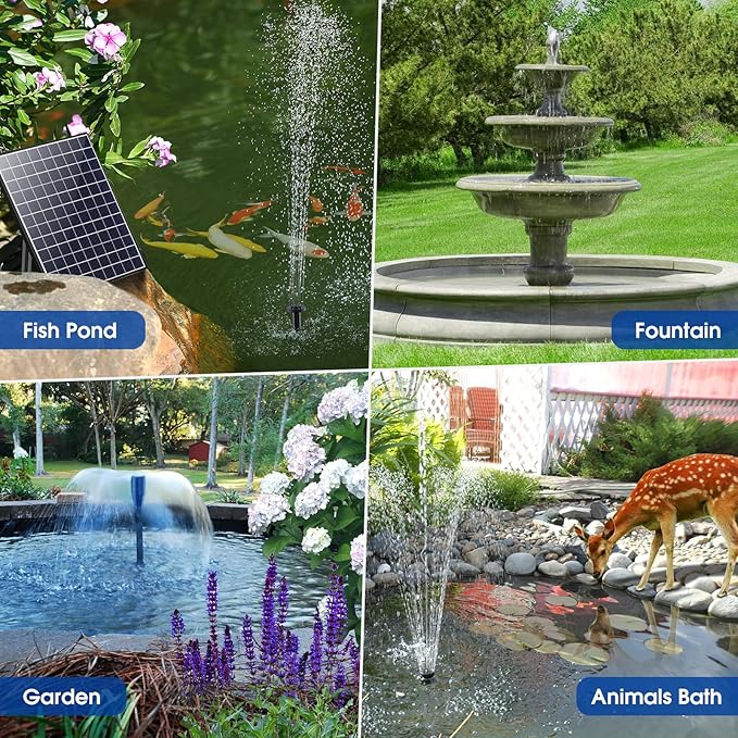 • ⛲【Easy Installation & Wide Application】The solar fountain pump equipped with a 90° angle adjustable mounting bracket, you can install it on the wall or on the ground. The 17ft long cord allow you to find the best place to place solar panel. Perfect for pond, wildlife decoration, fish tank, Waterfall, Hydroponics and water circulation for oxygen etc.
