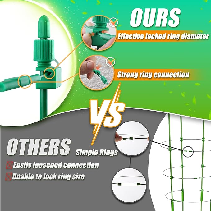 • Upgrade Sturdy Tomato Cages - The new version of support cages incorporates multiple enhanced designs to ensure stability and a robust weight-bearing capacity, eliminating concerns about sudden collapses. Crafted from rust-proof, plastic-coated metal, they ensure lasting durability.