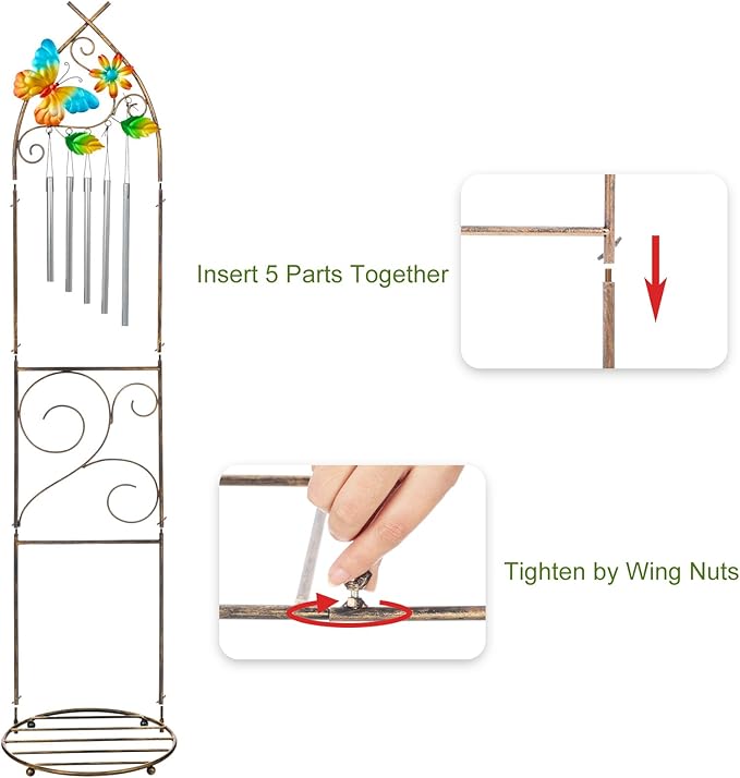 • Material:The garden plant trellis is made of metal material that are weather-resistant and built to last. It also has an eye-catching bronze finish ensures that it will not fade over time and aluminum tubes make beautiful sounds when a blows through