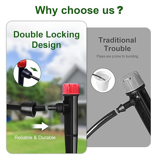 • Unique Design: Our Drip Emitters are Double Locking Design, which ensures a solid installation, prevents the hose from falling off and prevents water leakage. Drip Irrigation Sprinkler heads are removable and easy to clean, so you don't have to worry about clogging, making them perfect for long-term use.