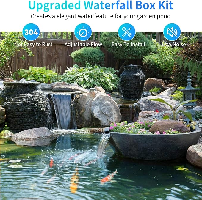• 🌊 【Upgraded Pond Waterfall Kits】The pond waterfall spillway includes stainless steel waterfall box, efficient 580GPH pump, 9.8ft sturdy flexible corrugated tube, tube clamps, sealants, and a pump filter bag. No need to buy additional parts, that you can build a waterfall for outdoor/pond/garden pond/landscape fountain.