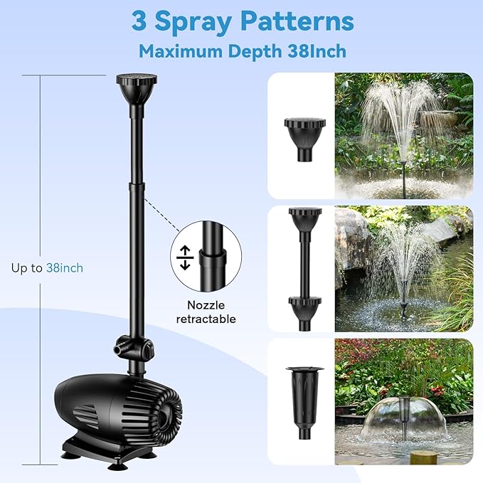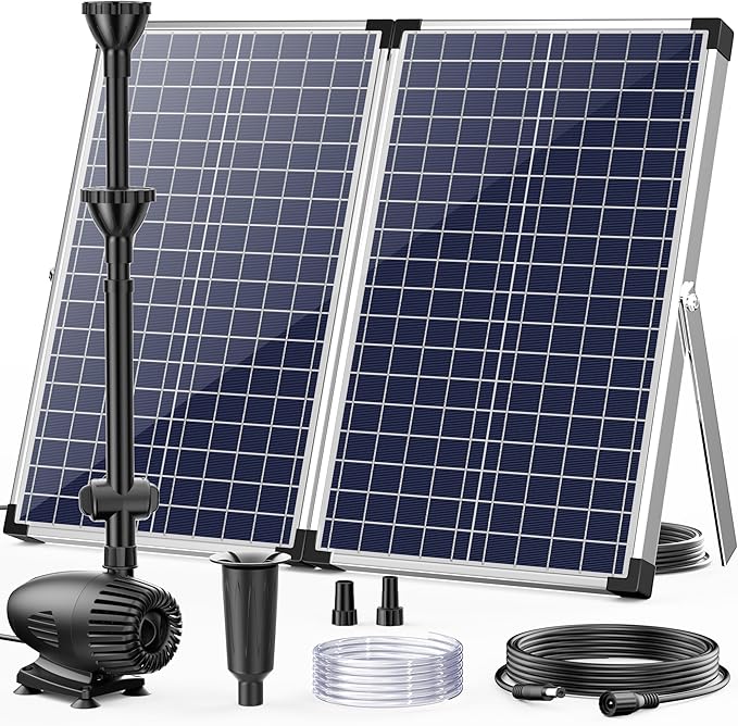 • ⛲【Muti-Protection】The solar pond pump features with water shortage protection that will shut off when the water runs out to avoid motor won't burned out. Two-way pre-filter design to preventing leaves or dust from clogging the pump. Detachable pump design for easy to clean and we also give extra 2 filter sponges to replace when cleaning the pump.