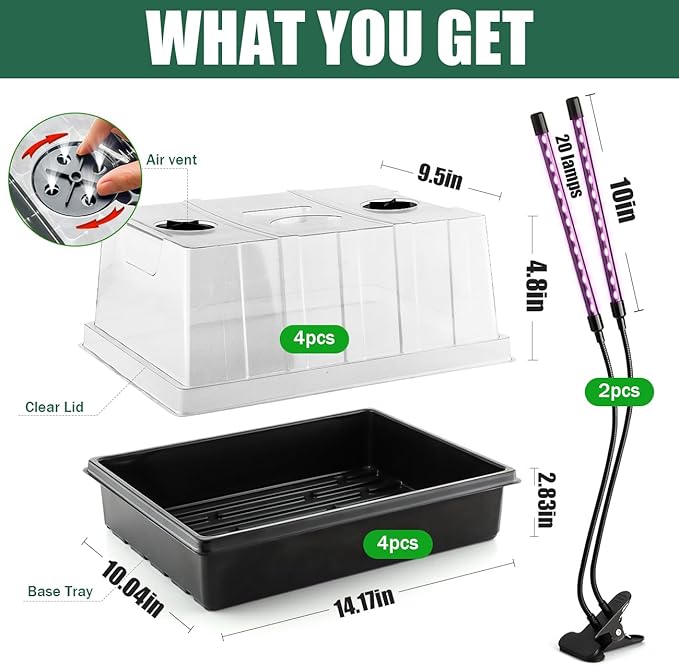 • 【Complete Indoor Seed Starter Kit with Grow Lights】Includes 4 durable seed trays with 5" tall humidity domes and 2 dual-head grow lights (4 heads total). Ideal for beginners and experienced gardeners to grow vegetables, herbs, or flowers indoors year-round. Everything you need to start seeds successfully in one easy-to-use set.