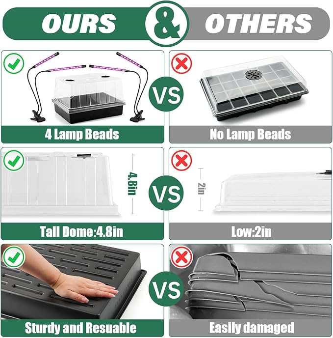 • 【Reusable Trays & High-Dome Humidity Covers】Made from thick, long-lasting plastic, the seed trays and snap-on humidity domes are reusable season after season. Adjustable air vents let you control humidity and airflow to create the perfect microclimate for sprouting seeds and growing strong seedlings.