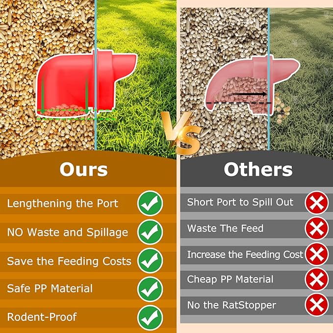 • No-Waste Design: Chicken feeder features a no-waste design with the feed opening extending downward, solving the problem of spilled feed.and was covered and rainproof design, come with connect seal, keep dry.
