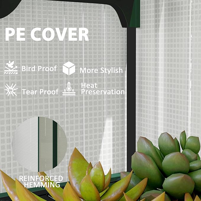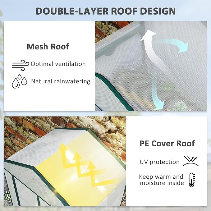 • Double-layer Roof Design: This outdoor greenhouse features a mesh roof on the top for enhanced ventilation and rainwater access while blocking small animals, complemented by a zip-up PE cover for optimal warmth and moisture retention