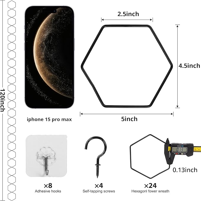 • Extended Size and Complete Accessories: Our plant climbing trellis includes 24 hexagons, 6 transparent hooks, and 4 black metal question mark hooks. The two types of hooks are compatible with various surfaces such as tiles and walls, meeting multiple hanging needs. With a total length of 120 inches, the extended size allows your plants to climb higher with ease